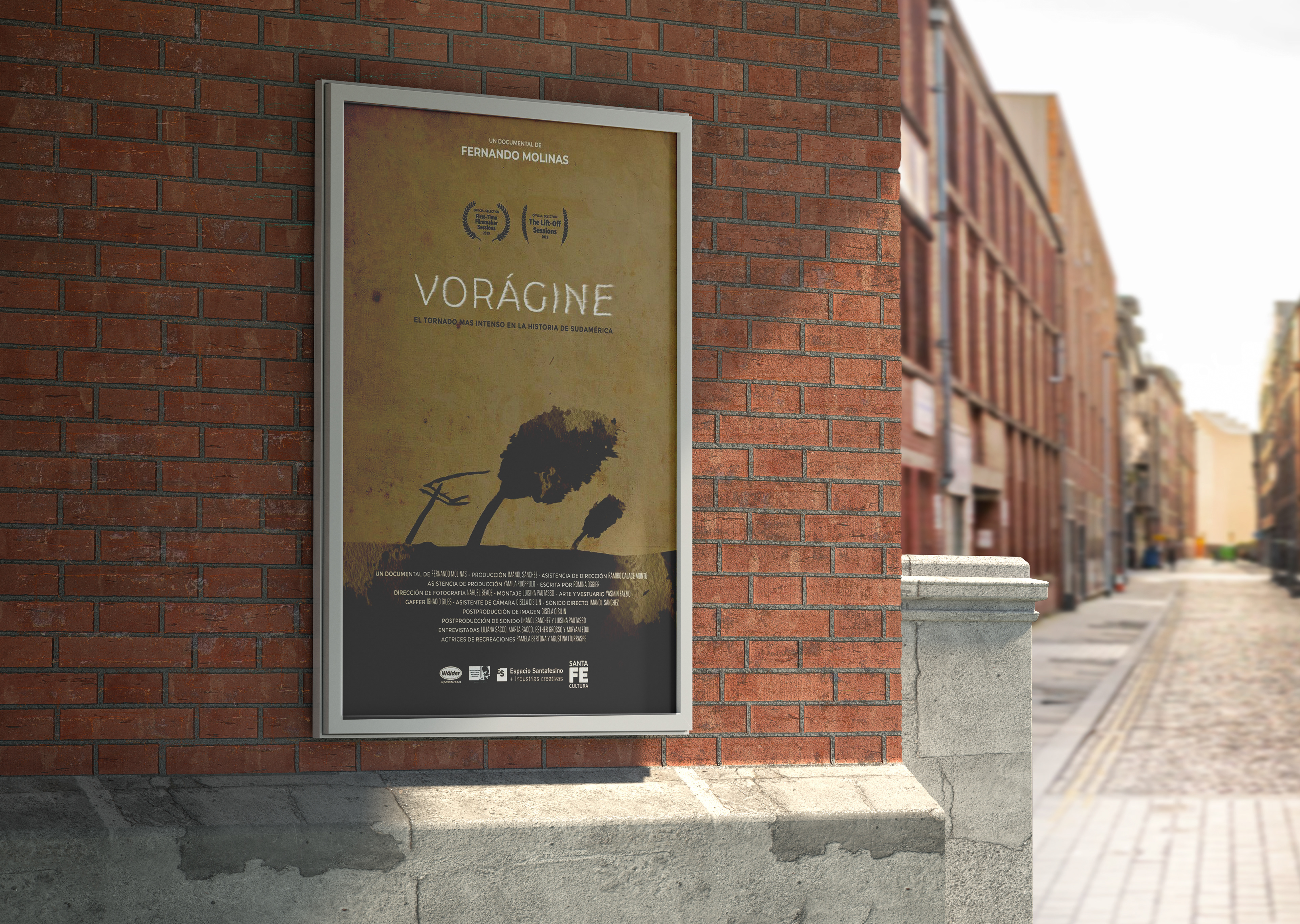 El corto documental llamado 'Vorágine. El tornado de San Justo' requería de un afiche como portada oficial, tanto para presentaciones como para plataformas digitales. Se buscaba una identidad propia del cortometraje, que retomara los conceptos fundamentales del material audiovisual inicial.