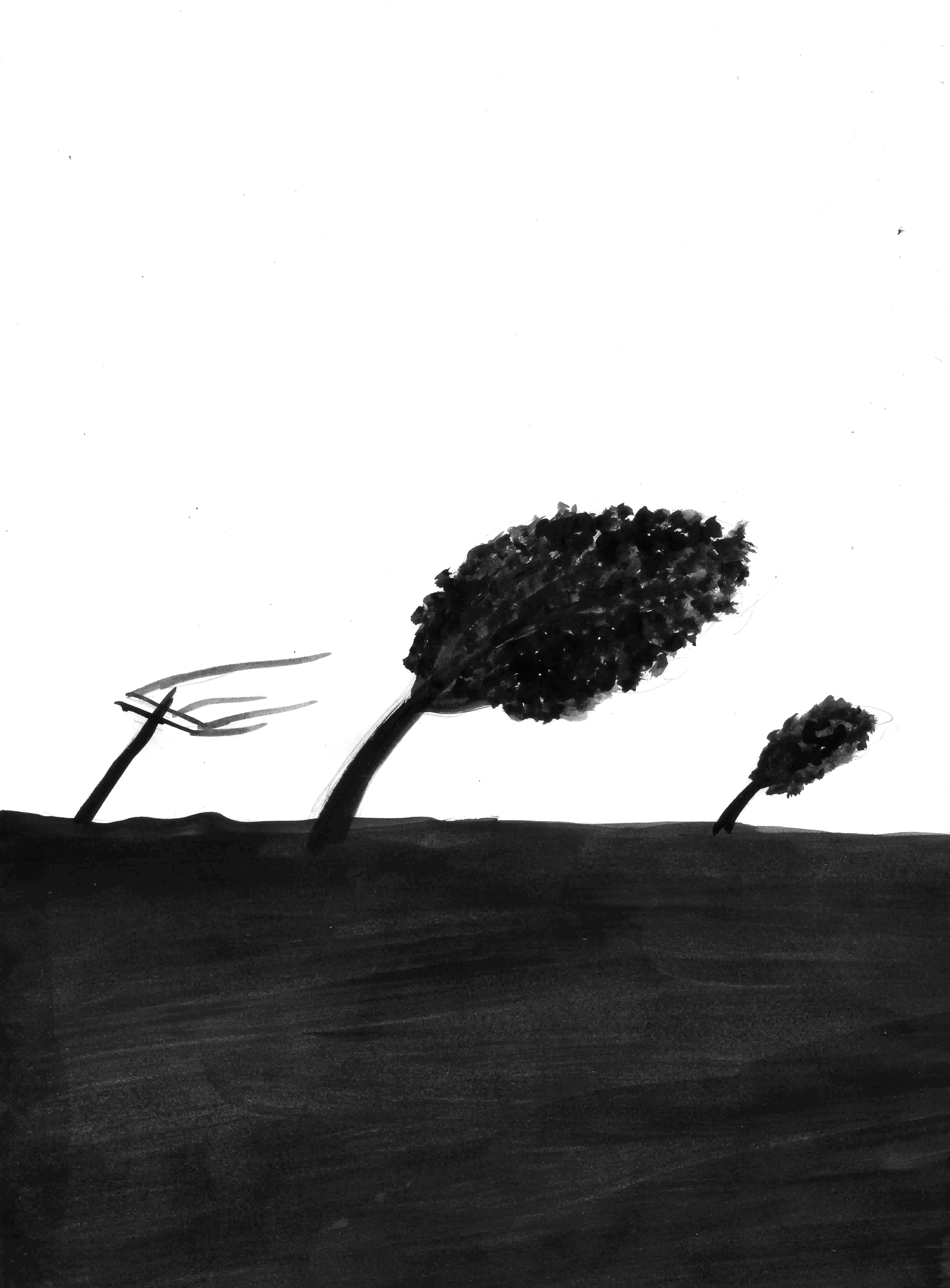 Hubo dos conceptos en particular que nos resultaron interesantes para seguir trabajando. El primero fue el recurso de la mancha de tinta, emulando las gotas de agua que caen sobre la tierra antes de que comience una tormenta; el segundo fue la imagen del árbol doblándose sobre sí mismo. Estas ideas nos brindaban esa pregnancia e impacto visual que buscábamos capturar.