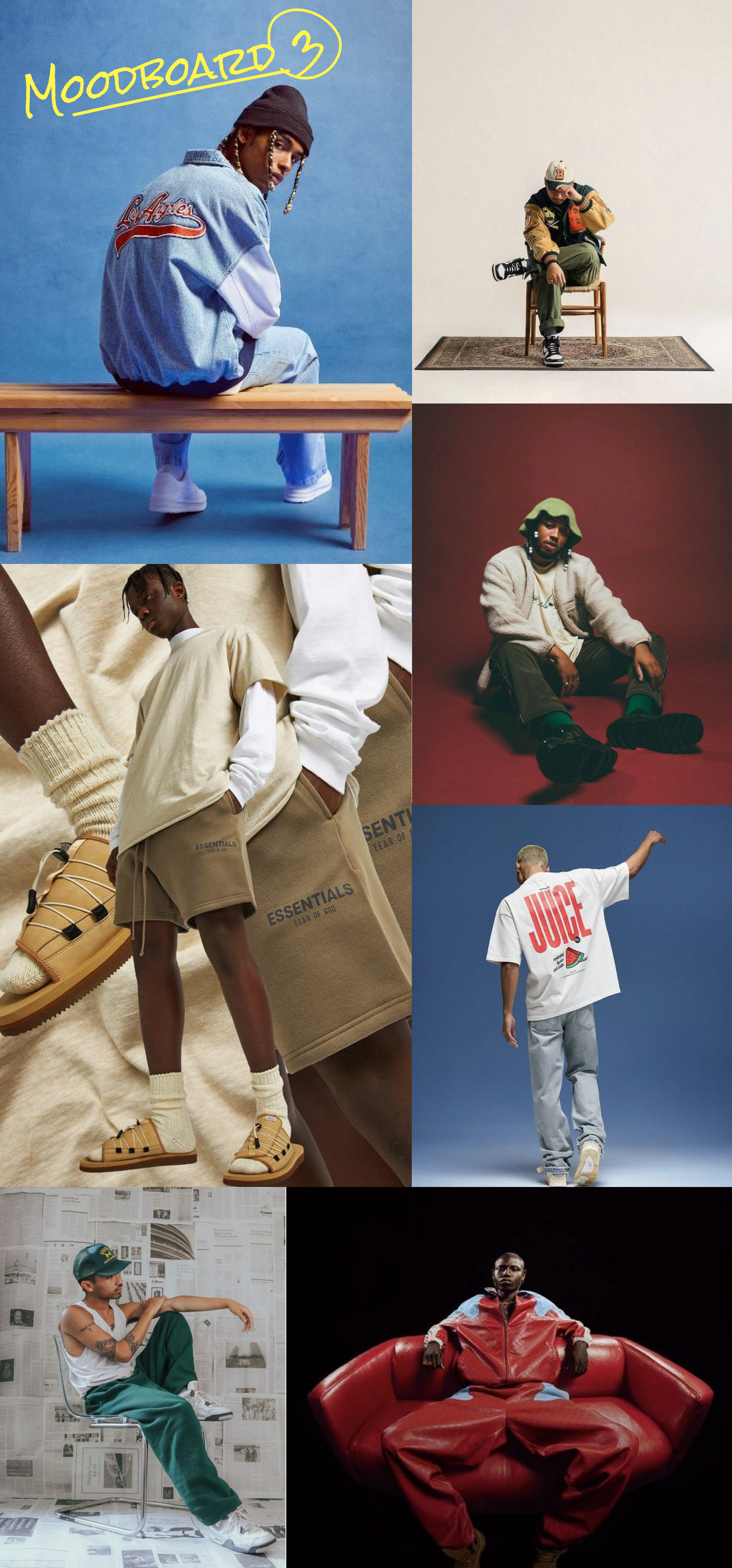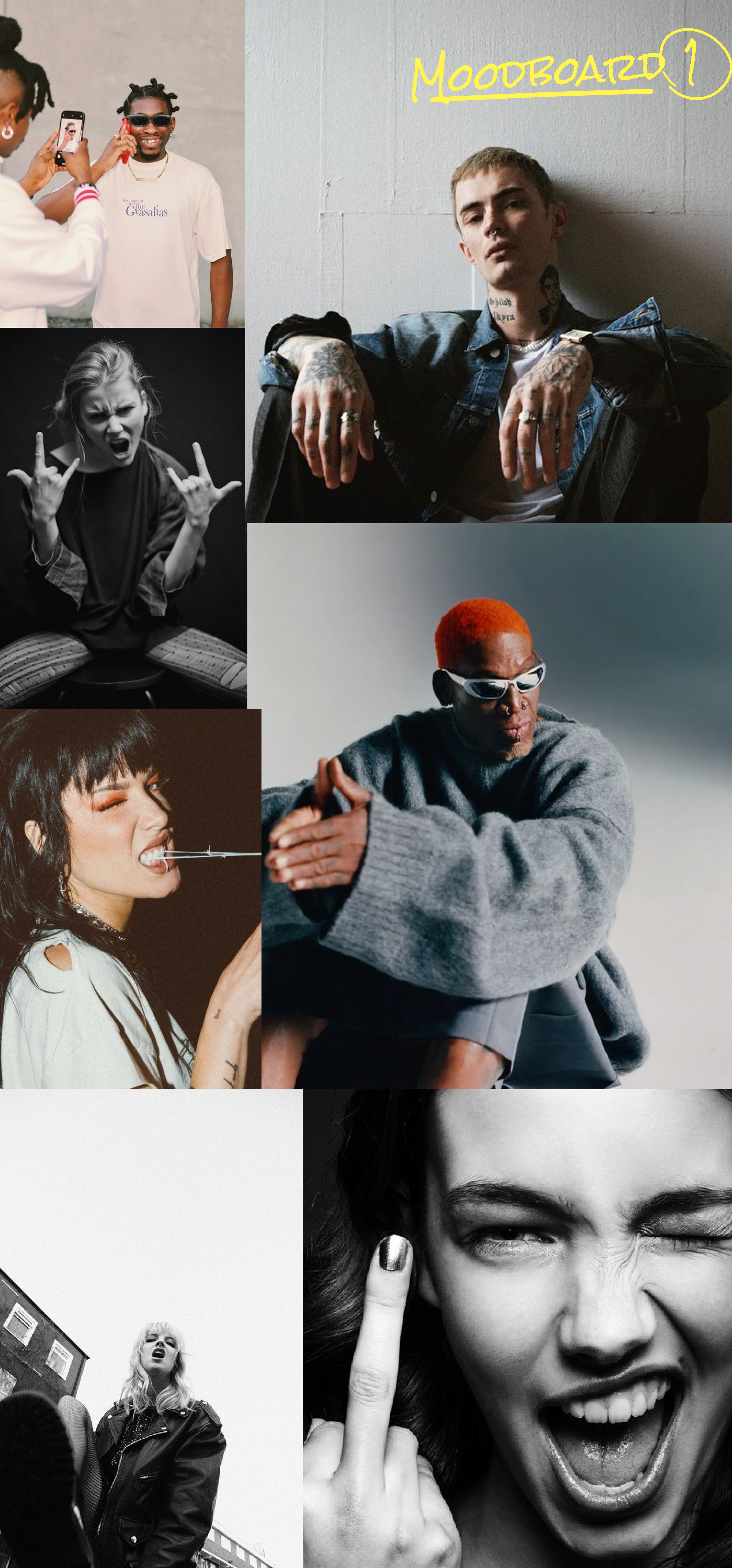 Realizamos una intensa búsqueda de referencias, pensando en las sesiones fotográficas que realizaríamos más adelante y en qué espíritu buscaríamos evocar en cada una de ellas. Para esto, armamos diferentes moodboards, con la premisa de visualizar lo siguiente: (1) una primera sesión 'trash', construyendo esta narrativa que representa la rebeldía, (2) una segunda sesión que evoca el amor, como una forma de sensibilidad que rompe con lo establecido, (3) y una sesión pensada para la página web, donde pretendíamos abandonar el concepto de fotoproducto común y repetitivo, para poder desarrollar la marca desde otros ángulos, y a la vez se complementando con todo lo anterior.